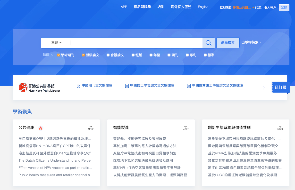 The Hong Kong Public Library provides free remote access to ไธญๅ็ฅ็ถฒ (CNKI). You can access it while at school and from home. This includes access to the China Academic Journals Full-text Database (CJFD) and also China Doctoral Dissertations and Masters' Theses Full-text Databases.